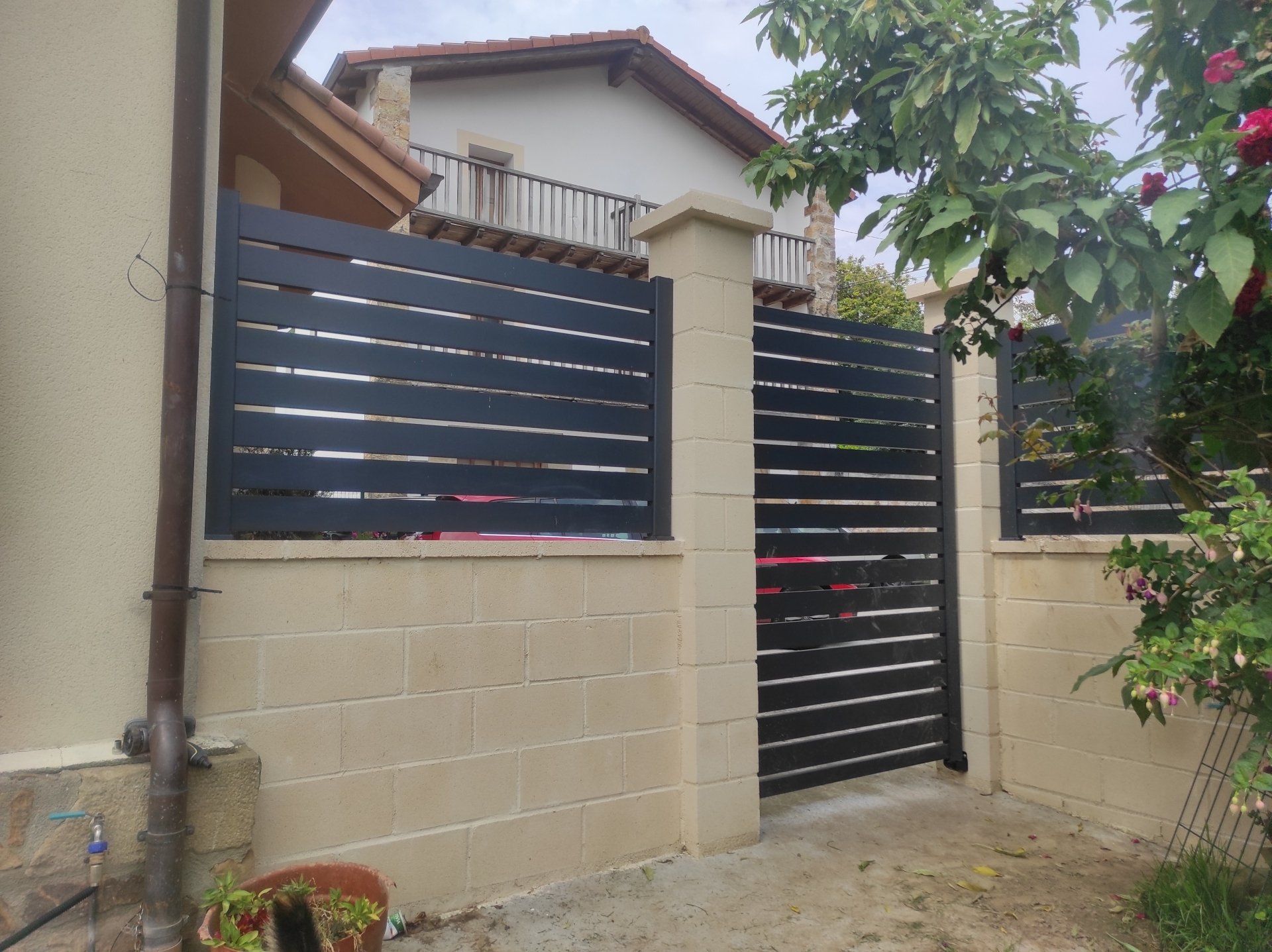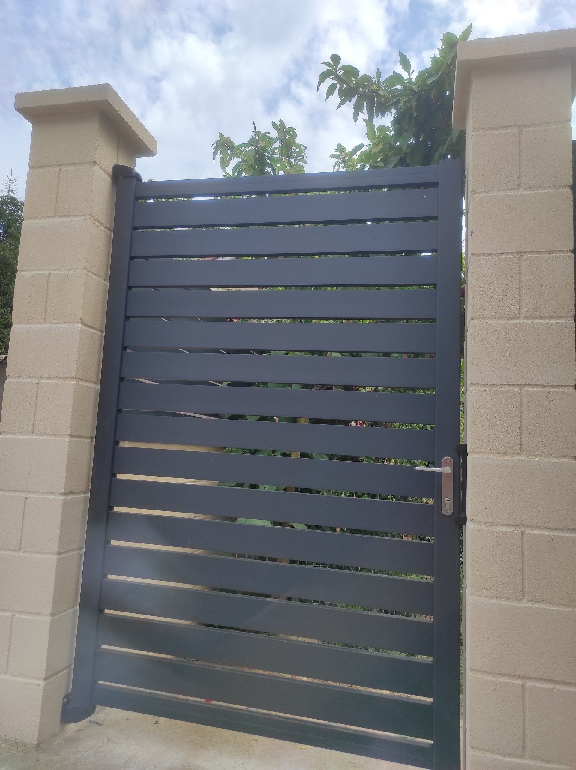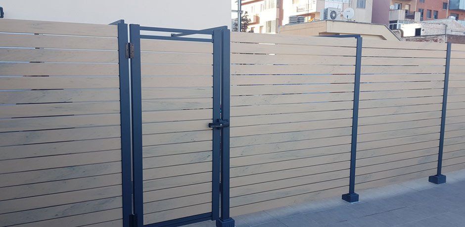 All doors have an aluminum frame and PVC or aluminium slats depending on the fence. They can have a manual lock or open with a push button from the home.